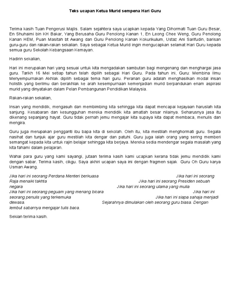 TEKS UCAPAN KETUA PENGAWAS SEMPENA HARI GURU TEKS UCAPAN HARI GURU. Teks Ucapan Wakil Murid Sempena Hari Guru Terima kasih Pengerusi Majlis. Pertama sekali saya mengucapkan berbanyak terima kasih kerana memberi peluang dan kesempatan kepada saya selaku wakil murid untuk.